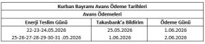 2026 yılı Kurban Bayramı resmî tatili dönemine ilişkin “Elektrik Piyasası Avans Ödeme” tarih bilgileri aşağıdaki tabloda belirtilmiştir.